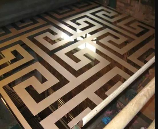 不銹鋼蝕刻板是在不銹鋼表面通過化學的方法,腐蝕出各種花紋圖案。以8K鏡面板、拉絲板、噴砂板為底板,進行蝕刻處理后,對物體表面再進行深加工,不銹鋼蝕刻板可進行局部的和紋,拉絲,嵌金,局部鈦金等各式復雜工藝處理,不銹鋼蝕刻板實現圖案明暗相間,色彩絢麗的效果。