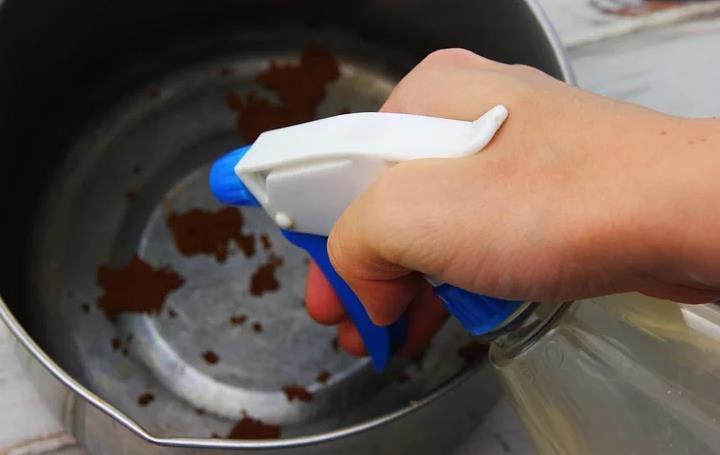 - 沖洗生銹的區域。例如,如果它在您的水槽中,請將水倒在上面。如果生銹在垂直表面上,請使用裝滿水的噴霧瓶并將其噴灑