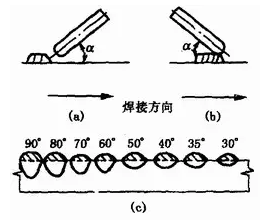 (2)電極(焊絲)傾角焊接時,電極(焊絲)相對于焊接方向可以傾斜一個角度。當電極(焊絲)的傾角順著焊接方向時叫后傾;逆著焊接方向時叫前傾,見圖1—32(a)、(b)。電極(焊絲)前傾時,電弧力對熔池液體金屬后排作用減弱,熔池底部液體金屬增厚了,阻礙了電弧對熔池底部母材的加熱,故焊縫厚度減小。同時,電弧對熔池前部未熔化母材預(yù)熱作用加強,因此焊縫寬度增加,余高減小,前傾角度。愈小,這一影響愈明顯,見圖1—32(c)。