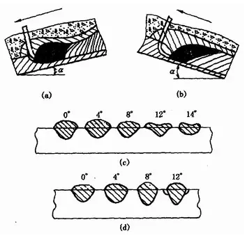 (a)下坡焊??(b)上坡焊??(c)下坡焊時焊件傾角的影響 (d)上坡焊時焊件傾角的影響
