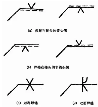 基本符號相對基準線的位置見圖1—27(a)、(b)、(c)、(d);標注對稱焊縫及雙面焊縫時,不加虛線。