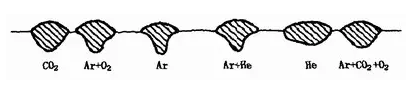 (6)保護氣體成分??氣體保護焊時,保護氣體的成分以及與此密切相關(guān)的熔滴過渡形式對焊縫形狀有明顯影響。采用不同保護氣體進行熔化極氣體保護焊直流反接時,焊縫形狀的變化,見圖1—35。射流過渡氬弧焊總是形成明顯蘑菇狀焊縫,氬氣中加入O2、CO2或H2時,可使根部成形展寬,焊縫厚度略有增加。顆粒狀和短路過渡電弧焊則形成的焊縫形狀寬而淺。