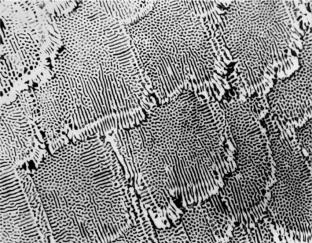 室溫下共晶白口鐵顯微組織如圖1.3.10所示。圖中黑色部分為珠光體,白色部分為滲碳體。