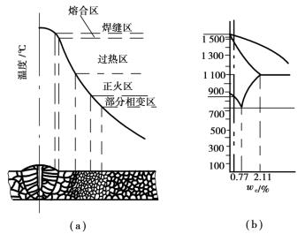 熱影響區(qū)各點(diǎn)的最高加熱溫度不同。因此,其組織變化也不相同。圖4.2.1為低碳鋼焊接接頭的組織變化。左圖為焊接接頭各點(diǎn)最高加熱溫度曲線,右圖為簡(jiǎn)化的碳鋼相圖。低碳鋼的熱影響區(qū)可分為過(guò)熱區(qū)、正火區(qū)和部分相變區(qū)。