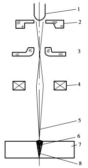 電子束焊接的定義 2019-07-0510:39:01電子束焊接的定義已關(guān)閉評(píng)論電子束焊接方法(圖4.3.5)屬于高能密度焊接方法。其特點(diǎn)是焊接時(shí)的能量密度大,可以焊出寬度小、深度大的焊縫,熱影響區(qū)以及焊接變形很小。電子束焊在真空中進(jìn)行,焊縫受到充分保護(hù),能保證焊縫金屬的高純度。電子束焊以前多用于航空航天、核工業(yè)等部門,焊接活性材料及難熔材料。現(xiàn)已應(yīng)用在汽車制造、工具制造等工業(yè),如焊接汽車大梁及雙金屬鋸條等。圖4.3.5 電子束焊原理1—陰極 2—控制板 3—陽極4—電磁透鏡 5—電子束6—聚焦束 7—工件 8—焊縫 贊 0 分享