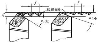 的作用是為了減小副切削刃與工件已加工表面之間的摩擦,以防止切削時(shí)產(chǎn)生震動(dòng)。副偏角的大小影響刀尖強(qiáng)度和已加工表面的粗糙度。如圖5.1.13所示,在切深、進(jìn)給量一定的情況下,減小副偏角可使殘留面積減小,表面粗糙度降低。
