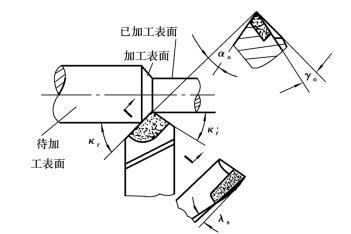 在切削平面中測(cè)量的主切削刃與基面之間的夾角。當(dāng)?shù)都馐乔邢魅猩献罡唿c(diǎn)時(shí),規(guī)定λs為正值;刀尖是切削刃上最低點(diǎn)時(shí),規(guī)定λs為負(fù)值。