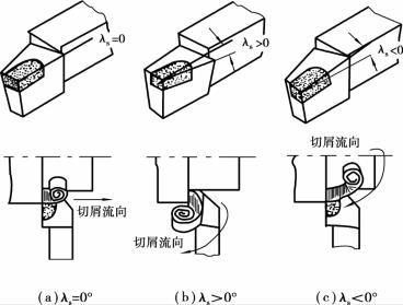 刃傾角λs主要影響刀尖的強(qiáng)度和切屑流動(dòng)的方向。如圖5.1.14所示,λs= 0°時(shí),切屑向著與主切削刃垂直的方向流動(dòng);λs>0°時(shí),切屑向著待加工表面方向流動(dòng);λs<0°時(shí),切屑向著已加工表面方向流動(dòng)。