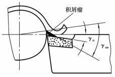 積屑瘤是由于切屑和前刀面劇烈摩擦產生黏結而形成的。當塑性金屬被切下的切屑沿前刀面流出時,在一定的溫度和壓力作用下,切屑底層受到很大的摩擦阻力,致使底層金屬的流動速度降低而形成“滯流層”。當滯流層金屬與前刀面之間的摩擦力超過切屑內部的結合力時,就有一部分金屬黏結在刀刃附近而形成積屑瘤。