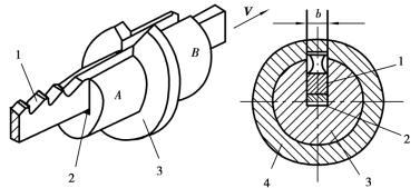 拉削鍵槽如圖5.2.57所示。拉削時,導向心軸3的A端安裝工件,B端插入拉床的“支撐”中,拉刀1穿過工件4的圓柱孔及心軸上的導向槽作直線移動,拉刀底部的墊片2用以調節工件鍵槽的深度以及補償拉刀重磨后齒高的減少量。拉削速度一般較低,常取V= 2~8 m/min,以避免產生積屑瘤。