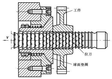 拉削圓孔如圖5.2.56所示。拉削孔徑一般為φ10~φ100 mm,孔的長徑比一般不超過3~5。拉削前的預制孔不需要精加工(鉆孔或粗鏜后即可)。拉削工件一般不需夾緊,僅需以工件端面支撐。因此,被拉削孔的軸線與端面之間應有一定的垂直度要求。當孔的軸線與端面不垂直時,應將端面貼緊在一個球面墊圈上,以便工件在拉削力的作用下,自動調節到與拉刀軸線一致的方向。